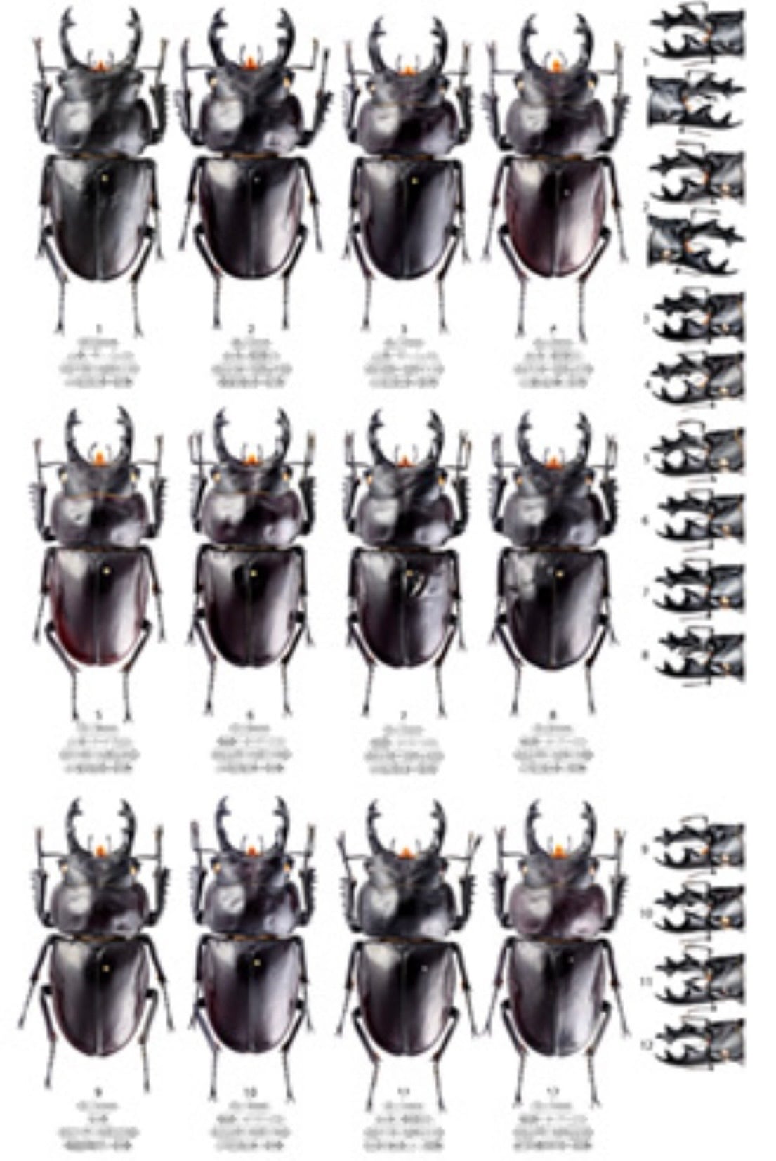 ①12人の若手クワガタ屋が採集した大型個体(62.0〜野外ギネス69.6 mm)+αの原寸大プレート ×12ページ(写真:法師人響)